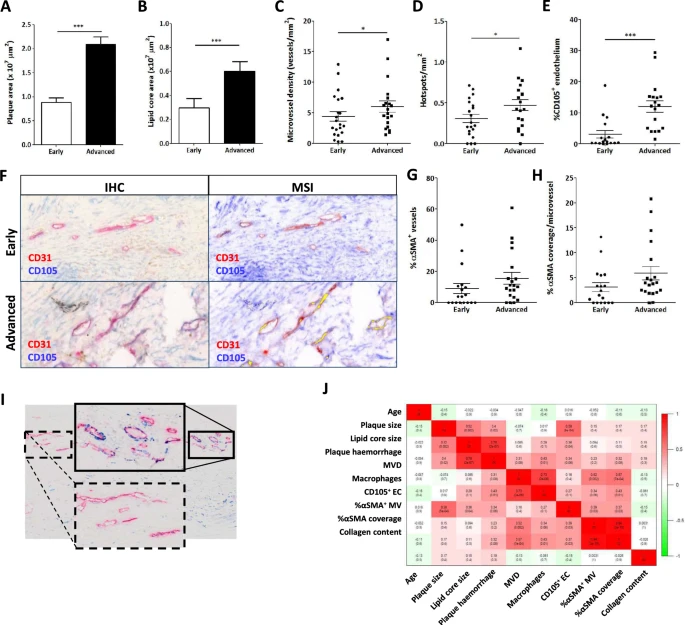 Fig. 1 Intraplaque microvessel characteristics differ between advanced stable and advanced unstable atherosclerotic lesions. A + B Plaque (A) and lipid core (B) size of the Maastricht Human Plaque Study cohort were determined and were, as expected, significantly increased in advanced lesions with hemorrhage compared to the stable early lesions. C + D Concomitantly, there was an increase in both microvessel density (C) and the number of microvascular hotspots (D) within the advanced lesions. (E + F) The percentage of angiogenic endothelial cells (CD105 + CD31+) was determined by double staining for CD105 and CD31 and subsequent multispectral imaging (MSI) and unmixing of the CD105 and CD31 signals. Image analysis showed that the proportion of CD31 + endothelial cells that were also positive for CD105 + (angiogenic EC) was significantly increased in advanced versus early plaques (E). Representative images of the double staining are presented in panel F. G + H Stability of the microvessels, assessed by percentage of vessels covered by αSMA+ smooth muscle cells (SMC, G), as well as the amount of SMC coverage per vessel (percentage αSMA-positivity, H) were not significantly different. I This lack of effect may be, in part, caused by the high variability in the degree of αSMA-coverage between different CD31+ hotspots. J We did not observe significant correlations between MVD and angiogenesis (CD105+) or vessel maturation αSMA+. Data are from 22 patients (both stable and unstable advanced lesions) (A–J); error bars indicate SEM (A–E, G, H); *p ≤ 0.05; **p ≤ 0.01; ***p ≤ 0.005. Scalebars indicate 20µm