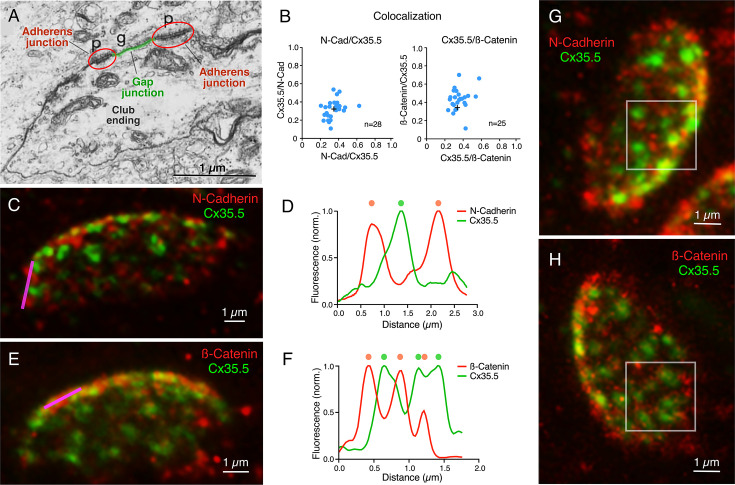 (A) Electron micrograph of a CE obtained in a 6 days post fertilization (dpf) zebrafish showing a GJ (g, highlighted in green) surrounded by AJs (p, encircled in red). ((A) was reproduced from Figure 5 of Kimmel et al., 1981, with permission from John Wiley and Sons. It is not covered by the CC-BY 4.0 license and further reproduction of this panel would need permission from the copyright holder; Kimmel et al., 1981.) (B) GJ and AJ proteins do not colocalize. Left: Cx35.5 and N-cadherin labeling show a low index of colocalization. Manders’ coefficient: N-cadherin/Cx35.5 0.35 ± 0.016 (x-axis); Cx35.5/N-cadherin 0.32 ± 0.019 (y-axis), n = 28 CEs from 10 fish. Right: Cx35.5 and β-catenin labeling also show low colocalization. Manders’ coefficient: Cx35.5/β-catenin 0.36 ± 0.017 (x-axis); β-catenin/Cx35.5 0.43 ± 0.024 (y-axis), n = 25 CEs from 12 fish. Cross mark indicates the average value. (C) Expansion microscopy of a CE contact area labeled for N-cadherin (red) and Cx35.5 (green) (projection of 47 sections at 0.40 µm z-step size). (D) Fluorescence profiles for N-cadherin and Cx35.5 obtained with a line scan (magenta line in C) are mutually exclusive. The small degree of colocalization observed in (B) is likely due to fluorophore amplification and the close spatial association between GJs and AJs, as shown in (A). (E) Image shows an expanded CE contact area labeled for β-catenin (red) and Cx35.5 (green) (projection of 12 sections at 0.60 µm z-step size). (F) Line scan (magenta line in E) shows that labeling for β-catenin and Cx35.5 is also mutually exclusive. (G, H) ‘En face’ view of the expanded contact area double-labeled for N-cadherin and Cx35.5, and β-catenin and Cx35.5, respectively, showing the close association of GJs and AJs throughout the synaptic contact area. Insets: the boxed areas in the ‘en face’ images highlight the mutually exclusive labeling (G: projection of 24 sections at 0.50 µm z-step size; H: projection of 16 sections at 0.60 µm z-step size). The scale bars represent actual dimensions; expanded images were not adjusted for the expansion factor.
