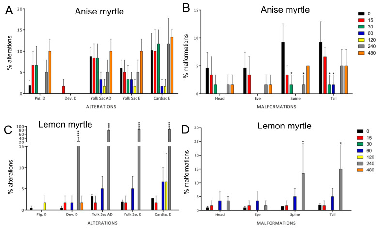 Developmental alterations (A,C) and malformations (B,D) were observed in zebrafish larvae exposed at 96 h post-fertilization to different concentrations of anise (A,B) and lemon (C,D) myrtle extract. The alterations observed were pigmentation delay (Pig. D), developmental delay (Dev. D), yolk sac absorption delay (Yolk Sac AD), yolk sac edema (Yolk Sac E), and cardiac edema (Cardiac E). The malformations observed were localized in the head, eyes, spine, and tail. None of the alternations observed in anise myrtle were significantly different from the control 0 mg/L group. In contrast, in Lemon myrtle, there were substantial alterations and malformations at 240 mg/L. The 480 mg/L group only includes very few survivors. Bar colours represent the concentrations tested in mg/L. Data represent the mean ± SD, n = 60. Asterisks indicate statistical significance when comparing the exposed groups with the control groups: p < 0.05 (*) and p < 0.001 (***).