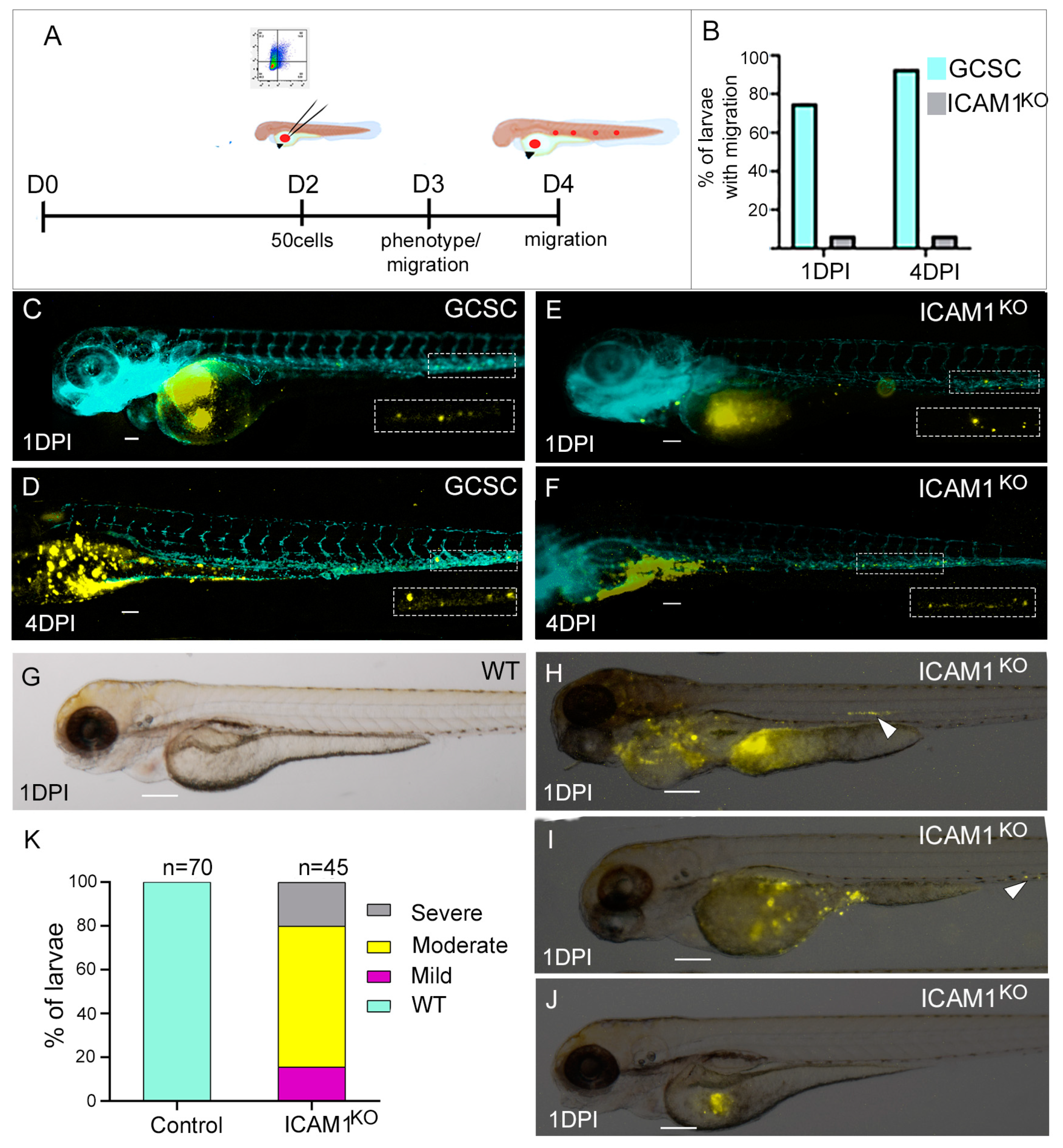 Fig. 6 The tumorigenic and migratory capabilities of xenotransplanted GCSC/ICAM1KO cells. (A) The experimental design. (B) The percentage of embryos with migrating GCSCs or GCSC/ICAM1KO cells after 1 and 4 dpi. (C,D) show larvae injected with GCSCs after 1 or 4 dpi, respectively. (E,F) show larvae injected with GCSC/ICAM1KO cells after 1 or 4 dpi, respectively. (H–J) show larvae after 1 dpi with severe, moderate, or mild phenotypes, respectively. (G) shows a wild-type larva. (K) shows the percentage of larvae with severe, moderate, or mild phenotypes (n = 45). The images were obtained with a Nikon SMZ1500 stereomicroscope. All the bars indicate 100 µm. GCSC = AGS/GCSC, and ICAM1KO = GCSC/ICAM1KO. All boxes and arrow heads indicate sites with migrating cells.