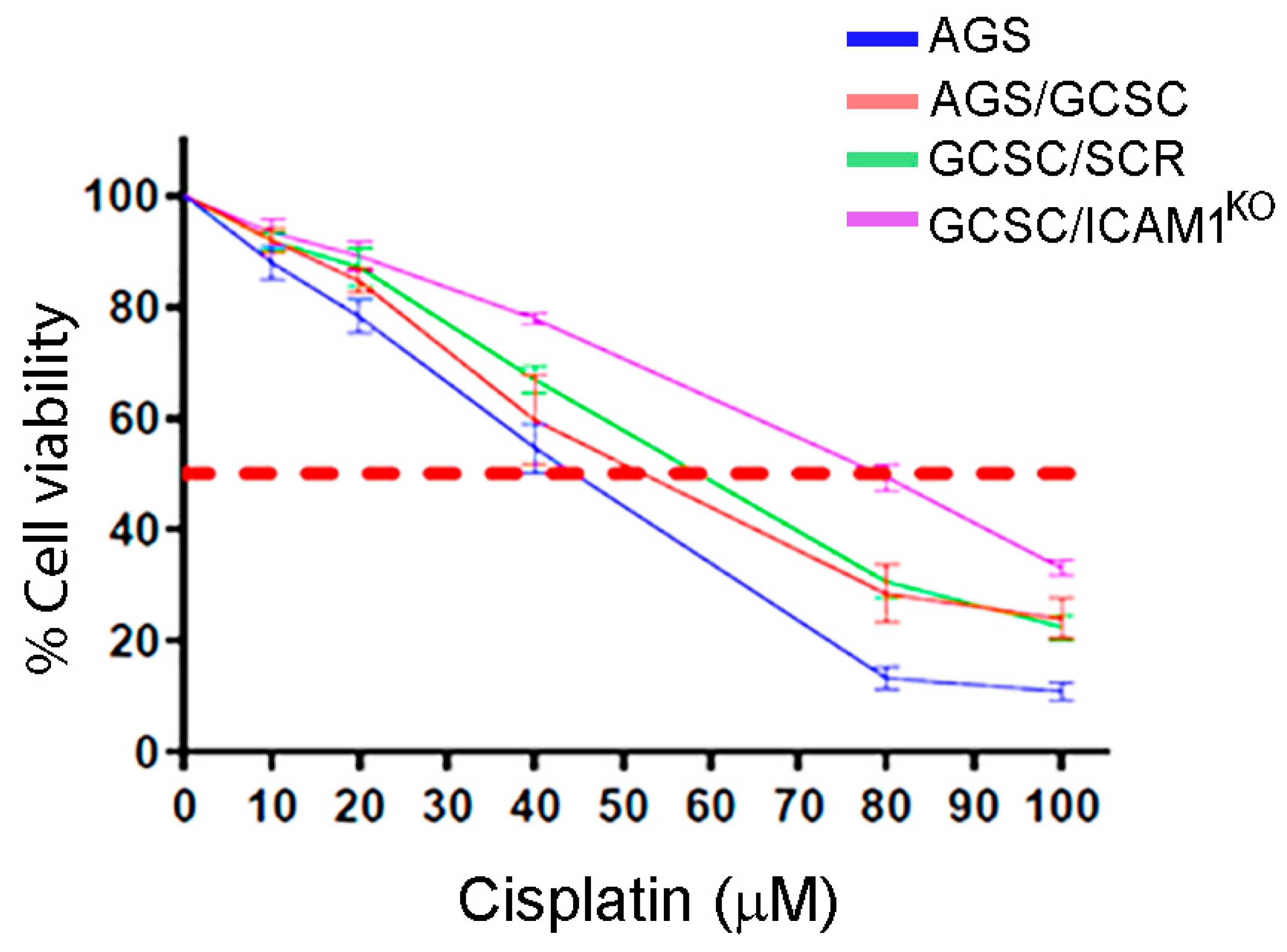 Fig. 8 GCSC/ICAM1KO cells exhibited an increased resistance to cisplatin. Viability percentages are shown for AGS (IC50 at 41.6 µM), AGS-GCSC (IC50 at 49.3 µM), GCSC-SCR (IC50 at 55.08 µM), and GCSC-ICAM1KO (IC50 at 79.2 µM) cells in the presence of different concentrations of cisplatin. n = data from 3 independent assays. The dotted line means the 50% of cell viability.
