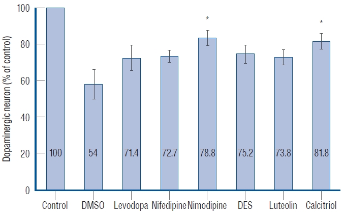 Fig. 6 Quantitative analysis of dopaminergic neurons in Tg(dat:EGFP) zebrafish ventral diencephalon. Data are expressed as a percentage of the control group. Each bar represents mean±standard deviation. *p<0.05 vs. the MPTP followed by DMSO-treated group. DMSO : dimethylsulfoxide, DES : diethylstilbestrol.