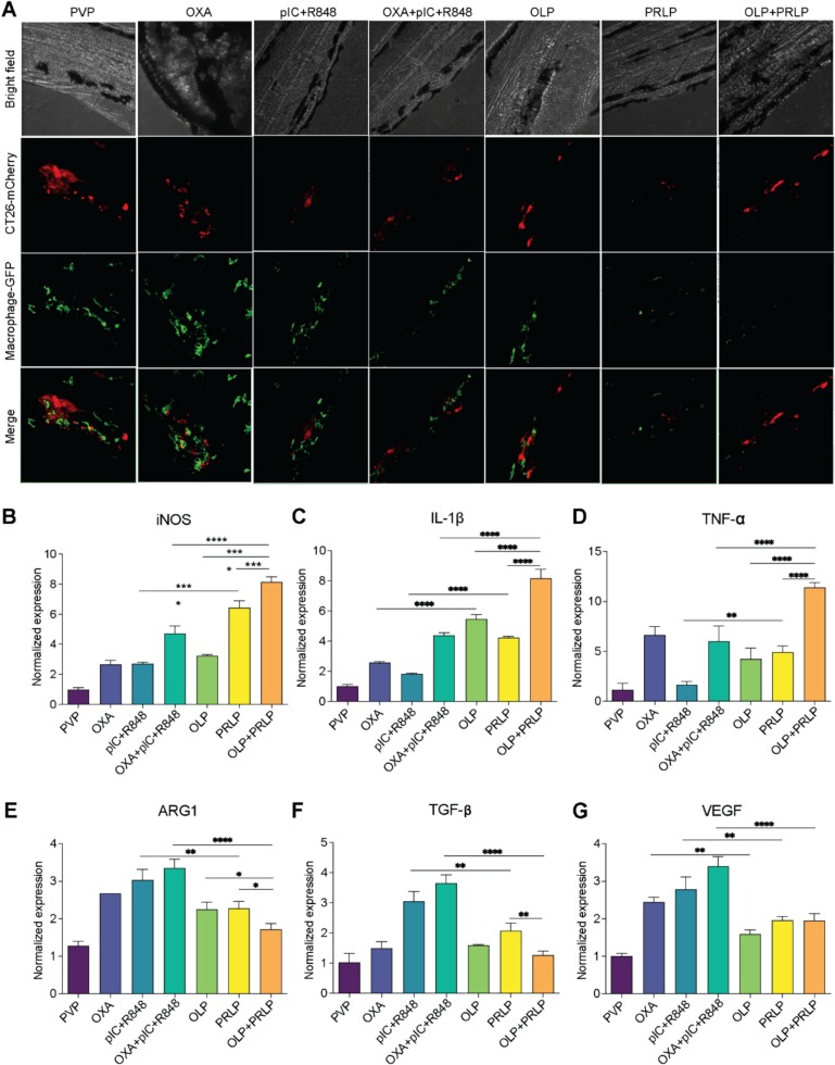 Fig. 8 Macrophages recruitment and cytokine release in zebrafish xenografts. A. Representative images of CT26 (in red) and macrophages (in green) in zebrafish xenografts at 5 dpi. B. Quantitative qPCR analysis for iNOS of zebrafish xenograft at 5 dpi. C. Quantitative qPCR analysis for IL-1β of zebrafish xenograft at 5 dpi. D. Quantitative qPCR analysis for TNF-α of zebrafish xenograft at 5 dpi. E. Quantitative qPCR analysis for ARG2 of zebrafish xenograft at 5 dpi. F. Quantitative qPCR analysis for TGF-β of zebrafish xenograft at 5 dpi. G. Quantitative qPCR analysis for VEGF of zebrafish xenograft at 5 dpi. (n = 3, results were shown in mean ± S.D., *, p < 0.05, **, p < 0.01, p < 0.01, ***, p < 0.001, ****, p < 0.0001). (For interpretation of the references to color in this figure legend, the reader is referred to the web version of this article.)