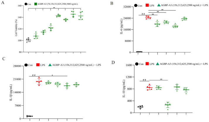 Fig. 4 The effect of AGBP-A3 on the secretion of IL-6, IL-1β, IL-10. (A) cells viability; (B) IL-6; (C) IL-1β; (D) IL-10. Data were presented as mean ± standard deviation (n = 5). LPS model group vs con (untreated group), ##P < 0.01. Data vs LPS model group, *P < 0.05, **P < 0.01.