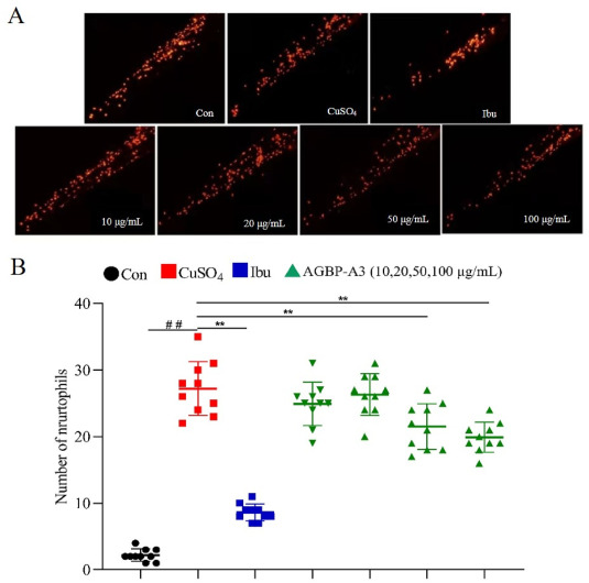 Fig. 5 The effect of AGBP-A3 on CuSO4-induced zebrafish inflammation model. (A) The observation of neutrophil migration; (B)The quantitative results of neutrophil migration. Data were presented as mean ± standard deviation (n = 10). CuSO4 model group vs Con (untreated group), ##P < 0.01. Data vs CuSO4 model group, *P < 0.05, **P < 0.01.