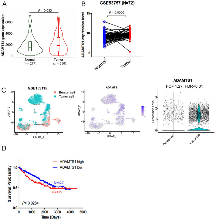 Elevated ADAMTS1 expression in renal cell carcinoma (RCC) tissues is associated with a poor prognosis. A ADAMTS1 mRNA levels in RCC tissues were significantly higher than those in normal renal tissues (p = 0.033) as determined by TNMplot (https://tnmplot.com/analysis/). B ADAMTS1 expression was assessed in 72 matched clear cell (cc)RCC tissues and their corresponding normal tissues using data from the GSE53757 ccRCC expression microarray dataset. C The left panel of the Uniform Manifold Approximation and Projection (UMAP) plot illustrates the distribution of tumor cells and benign epithelial cells based on single-cell RNA sequencing (scRNA-seq) profiles. The UMAP plot in the middle panel shows the expression distribution of ADAMTS1. The violin plot in right panel indicates that ADAMTS1 exhibits a significant elevation in tumor cells compared with benign epithelial cells, with a fold change (FC) of 1.27 and a false discovery rate (FDR) of less than 0.01. D Kaplan–Meier analysis depicts overall survival (OS) rates in patients with ccRCC based on high or low ADAMTS1 expression using data from TCGA