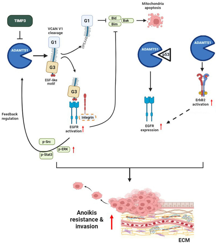 Schematic presentation depicting the ADAMTS1–VCAN–EGFR axis in promoting the anoikis resistance and invasive abilities of renal cell carcinoma (RCC). ADAMTS1 mediates the proteolytic cleavage of VCAN V1, thereby activating EGFR cascades to promote anoikis resistance and invasion of RCC cells. Moreover, ADAMTS1 interacts with p53 to modulate EGFR expression. EGFR-driven signaling might potentially reinforce ADAMTS1 expression through positive feedback. Bold dashed oval and arrow indicate hypothetical molecules and pathways that participate in ADAMTS1-mediated EGFR activation or expression. The cyclic elevation of ADAMTS1 and EGFR exacerbates anoikis resistance and invasiveness in RCC cells
