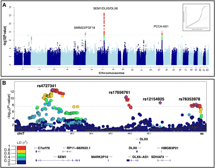 Fig. 1 Summary of the genome-wide analysis of coronal nonsyndromic craniosynostosis. A. Manhattan plot of the meta-analysis of discovery and replication genome-wide association analyses using common variants (minor allele frequency > 1%). The y-axis shows the −log10 transformed P value of each variant association found using a standard-error-weighted approach and controlling for population stratification, and the x-axis shows the chromosomal position. Variants crossing the genome-wide significance threshold of P < 5E−08 are color coded in red, and those with P < 5E−06 are in green. The top signals are annotated with the closest genes. Inset: quantile-quantile plot showing distribution of expected P values under the null model (red-dotted line) vs observed P values (black dots). B. Regional plot of the 4 top independent genomic association signals from the European meta-analyses. The y-axis shows −log10 P values for individual variants annotated with the genes in the selected genomic interval. The top variants are marked as purple diamonds and other variants in pairwise linkage disequilibrium (r2) with the top variant, based on the 1000 Genomes Project Phase 3 European reference samples, are color coded as per the scale in legend.