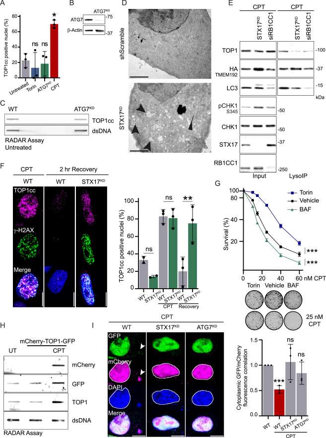 Fig. S2 Autophagy regulates TOP1 degradation to promote DNA damage repair and cell survival, related to Figure 2 (A) Immunofluorescence of TOP1cc foci in WT cells, after induction of shATG7 (ATG7KD), 4 h of treatment with 250 nM Torin, or 2 h of treatment with 50 nM CPT. Quantification of positive nuclei for TOP1cc foci (n = 3). Two-way ANOVA, error bar, SD; comparison against untreated. (B) Immunoblot showing ATG7 depletion in cells used for immunofluorescence and RADAR. (C) RADAR assay to assess TOP1cc level in WT and ATG7KD cells unchallenged (n = 2). Double-stranded (ds) DNA is used as a loading control. (D) Electron microscopy images of HeLa cells transformed with scrambled short hairpin RNA (shRNA; control) and STX17 shRNA. STX17KD presents an accumulation of double-membrane structures, labeled with arrows. (E) LysoIP was performed in HeLa WT or STX17KD, and cells were depleted for RB1CC1 (FIP200) using small interfering RNA (siRNA). Cells were released from a single thymidine block into S-phase and treated with 50 nM CPT and 50 nM BAF for 5 h (n = 3). (F) Immunofluorescence of TOP1cc foci in WT cells or in STX17KD untreated, after 2 h of treatment with 50 nM CPT and after 2 h recovery from CPT treatment. Scale bar, 10 μm. Quantification of positive nuclei for TOP1cc foci (n = 3). Two-way ANOVA. Error bar, SD. (G) Quantification of clonogenic assay of S-phase-synchronized cell treated for 6 h with CPT and either 150 nM Torin-1 or 50 nM BAF (n = 3). Error bar represents mean ± SEM. Two-way ANOVA on the area under the curve. Representative images of untreated or 25 nM CPT colonies obtained by clonogenic assay. (H) RADAR assay to assess the accumulation of TOP1cc when TOP1 is fused to GFP and mCherry after 1 h of 100 nM CPT (n = 2). Double-stranded (ds) DNA is used as a loading control. UT, untransfected untreated condition. (I) Imaging of the reporter mCherry-TOP1-GFP after 3 h of treatment with 50 nM CPT (nM) in WT cells, STX17KD, or ATG7KD (n = 3). Scale bar, 10 μm. Quantification of the correlation between GFP and mCherry fluorescence in the cytoplasm. Two-way ANOVA. Error bar, SD. ∗p < 0.05; ∗∗p < 0.005; ∗∗∗p < 0.0005; ns, not significant.