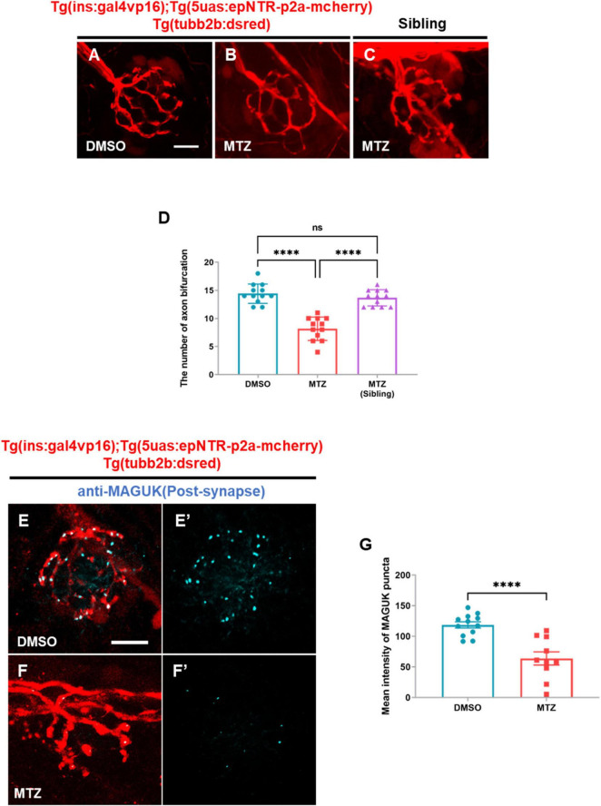Depletion of insulin production caused peripheral neuropathy in the peripheral lateral line nerve of ins:epNTR-mCherry zebrafish.