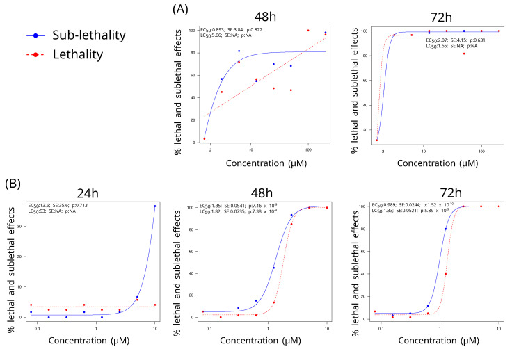 Lethality and sub-lethal effects of zebrafish embryos exposed to various concentrations of A. pseudoplatanus toxins, hypoglycin A, and methelynecyclopropylacetate over 72 h. The experiment was conducted to determine the median lethal (LC50) and median sub-lethal (EC50) concentration for hypoglycin A (A) and methelynecyclopropylacetate (B) at 24, 48, and 72 h post-exposure. Data were obtained from three independent replicates with 20 embryos per concentration per replicate. The LC50 and EC50 values were calculated using a four-parameter log-logistic model implemented with the drc R package, along with the associated standard error and the p-value. The sample size was 60 individuals per concentration (3 trials × 20 individuals), and the statistical test was a logistic regression with four parameters.