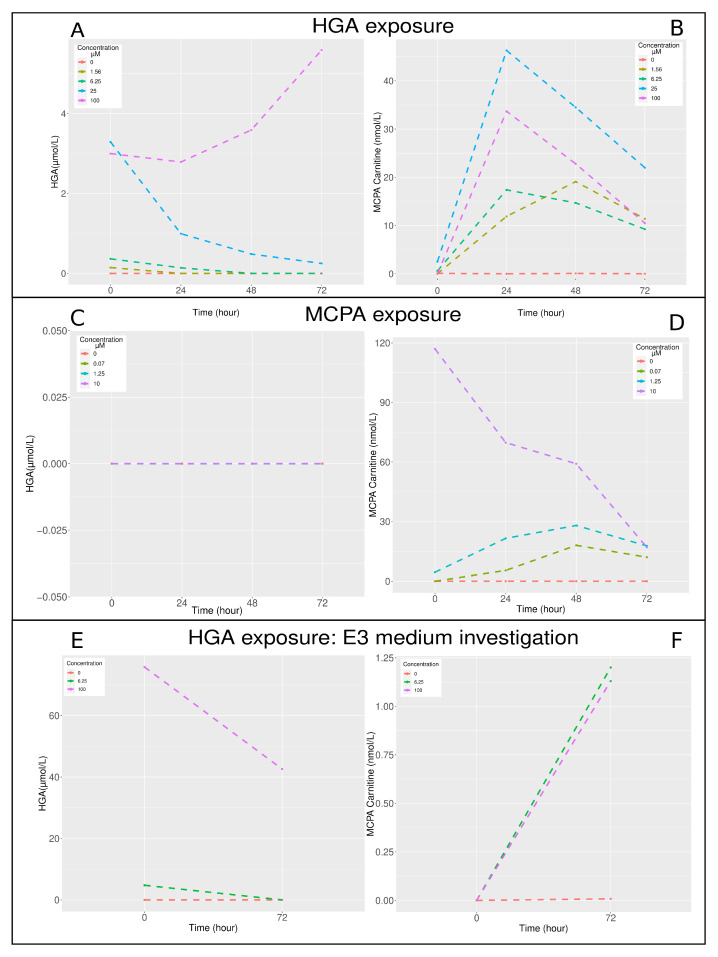 Time course of HGA and MCPA–carnitine concentrations in zebrafish larvae (24 hpf) after intoxication with HGA and MCPA. Hypoglycin A (