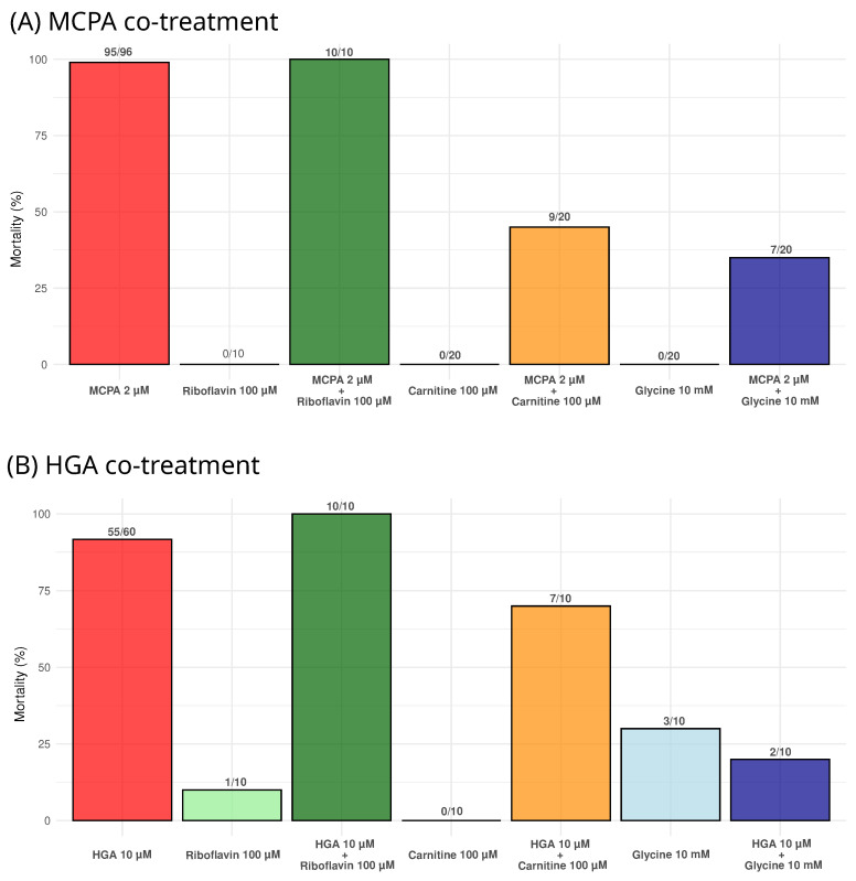 Assessment of riboflavin, carnitine, and glycine co-treatment effects on the mortality of zebrafish larvae in the presence of MCPA (in (