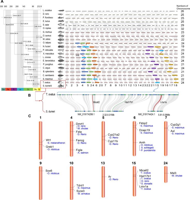 Fig. 4 Sex determining region (SDR) analysis in radial fins fish. A. The genomic synteny among the twenty-two fishes. Phylogenetic relationship of golden pompano and relevant twenty-one teleost lineages, and chromosome evolutions of the twenty-two teleosts. Divergence ages are shown on the joinpoints of the tree. The divergence age was estimated using the nodes with calibration times derived from the Time Tree database. Ages do not represent the exact point estimates. Chromosome evolutions were analyzed according to the multicollinearity among chromosomes of lineages. The chromosome number of golden pompano was shown. The bright blue boxes with labeled chromosome numbers represent the known SDRs in other lineages. The dark blue, green, brown, purple and yellow box means the clinearity of other fishes with corresponding to known SDR-linked Chromosome XXII, 3, 12, 15, and 12. B. Micro-colinearity between golden pompano and the S. dumeri at SDR. Scaffolds (NW_019174299.1 and NW_019174424.1) were homologues with the SDR of golden pompano. C. Genomic locations of the golden pompano SDR genes and SDR-homologous genes in golden pompano. SDR genes previously reported in other fishes (see species name in the picture) were used for localized the homologous genes in golden pompano. (For interpretation of the references to color in this figure legend, the reader is referred to the web version of this article.)