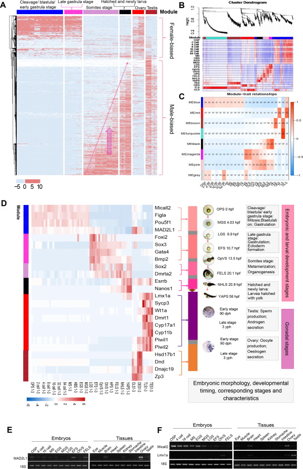 Fig. 5 Sex-biased gene expression throughout development. A. Heatmap of the sex-related genes in 19 embryonic developmental stages were clustered based on the FPKM value. B. Heatmap of the gene co-expression network. Clustering dendrograms of all sex-related genes, with dissimilarity based on the topological overlap and assigned module colors. Seven modules were clustered and displayed in different colors. C. Module-trait associations. Each column corresponds to a development stage, and each row corresponds to a module. The number in the rectangle is the correlation coefficient, and the number in brackets is the corresponding p value. D. Heatmap of the selected 24 sex-related stage-specific genes filtered by previously documented and the KME value > 0.7. In each module, the corresponding development stage and time were listed in the right part. E F. PCR validation of MAD2L1 (E), Micall2 and Lmx1a (F) in embryos and organs of golden pompano. 18S RNA was used as a reference. OSP, oosperm; MS, morula stage; EGS, early gastrula stage; MGS, middle gastrula stage; LGS, late gastrula stage; EFS, embryo formed stage; OTVS, otocyst vesicle stage; FELS, formation of the eye lens.