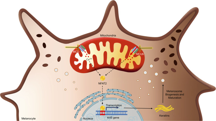 Graphical summary of the work illustrating that silencing of MCU decreases melanogenesis while MCUb knockdown enhances melanogenesis. Transcription factor NFAT2 gets activated upon MCU silencing and that in turn induces keratin5 expression. Keratin5 drives melanogenesis by augmenting melanosome biogenesis and maturation. MCU, mitochondrial calcium uniporter.