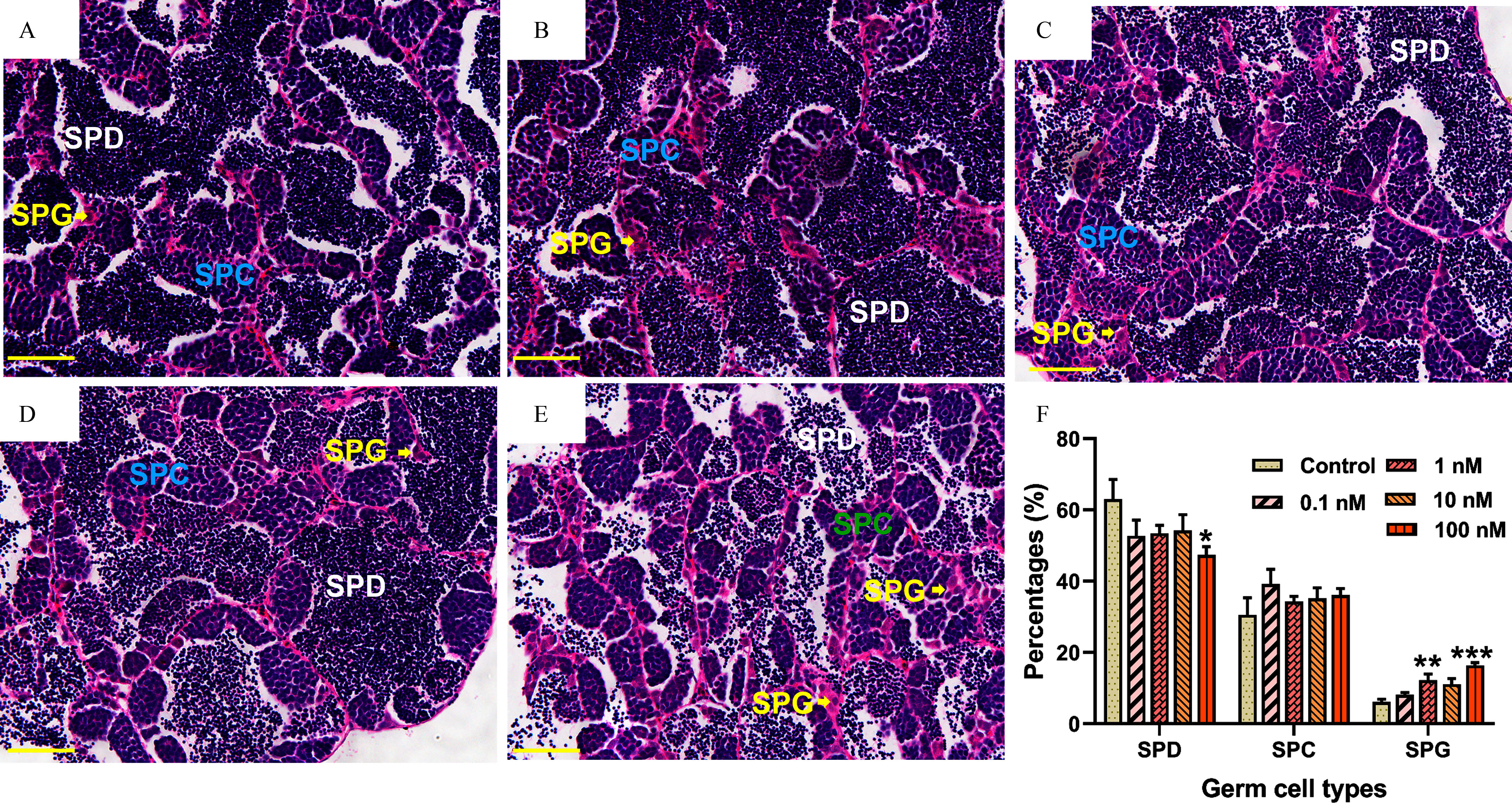 Histological observations of male zebrafish testes after 2-month in vivo exposure to DBDPE. (A−E) Typical hematoxylin/eosin–stained sections of testes in 0, 0.1, 1, 10, and 100 nM-exposure groups, respectively. (F) Proportion quantification of germ cells at different developmental stages in testes (n=6–9 fish/group). Results are represented as means±standard errors of the mean (SEMs). Scale bar: 50μm. Data are reported in Excel Table S3. Note: DBDPE, decabromodiphenyl ethane; SPC, spermatocytes; SPD, spermatozoa; SPG, spermatogonia. *p<0.05, **p<0.01, and ***p<0.001 indicate significant differences between exposure and control groups, by one-way analysis of variance (ANOVA) followed by the post hoc least significant difference (LSD) test.