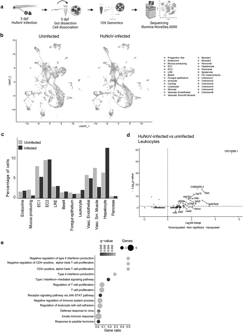 A scRNA-seq analysis on dissected zebrafish larval intestines shows an increase in leukocytes and an important role in the antiviral immune response. (a) Experimental design for transcriptional profiling of single cells in the zebrafish intestine. (b) Aggregated data of all intestinal cells (N = 22,958 cells (11,631 from uninfected and 11,327 from HuNoV-infected zebrafish larvae)) are represented by UMAP clustering and colored according to the unique cell cluster based on their transcriptional profile. (c) Differences in the proportions of cells between the uninfected and HuNoV-infected conditions are further displayed in detail in bar charts. (d) Volcano plots showing DEGs for the comparison of HuNoV-infected versus uninfected zebrafish larval leukocytes within the intestines. A vertical dotted line marks a log2(fold change) value of zero, while the horizontal dotted line marks a BenjaminiHochberg q-value of 0.05. Genes involved in relevant pathways involved in the innate immune response of antiviral signaling are displayed. (e) Dot plot showing the results of a ClueGO hypergeometric enrichment pathway analysis of upregulated DEGs using the gene ontology - biological process database. HuNoV = human norovirus, DEGs = differentially expressed genes.