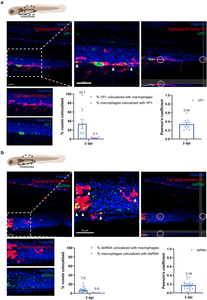 Macrophages in the intestines are infected by HuNoV and allow active viral replication. (a-b) whole mount immunohistochemistry confocal images of Tg(mpeg:mCherry-F) zebrafish larvae infected with HuNoV taken at 2 dpi at a 25X magnification focusing on the intestines using Hoechst, a primary mCherry antibody, and (a) a VP1-targeting antibody or (b) a dsRNA-targeting antibody. Cross-section views created in imaris software show horizontal and vertical sections of macrophages that contain (a) VP1 or (b) dsRNA with the white circle highlighting an infected cell of interest. Imaris 3D Colocalization software calculated the overlap of voxels between macrophages and (a) VP1 or (b) dsRNA (N = 10-19) together with a thresholded Pearson coefficient, mean values ± SEM are shown. HuNoV = human norovirus, dpi = days post infection, VP1 = viral protein 1, major capsid protein, dsRNA = double-stranded RNA, SEM = standard error of means.