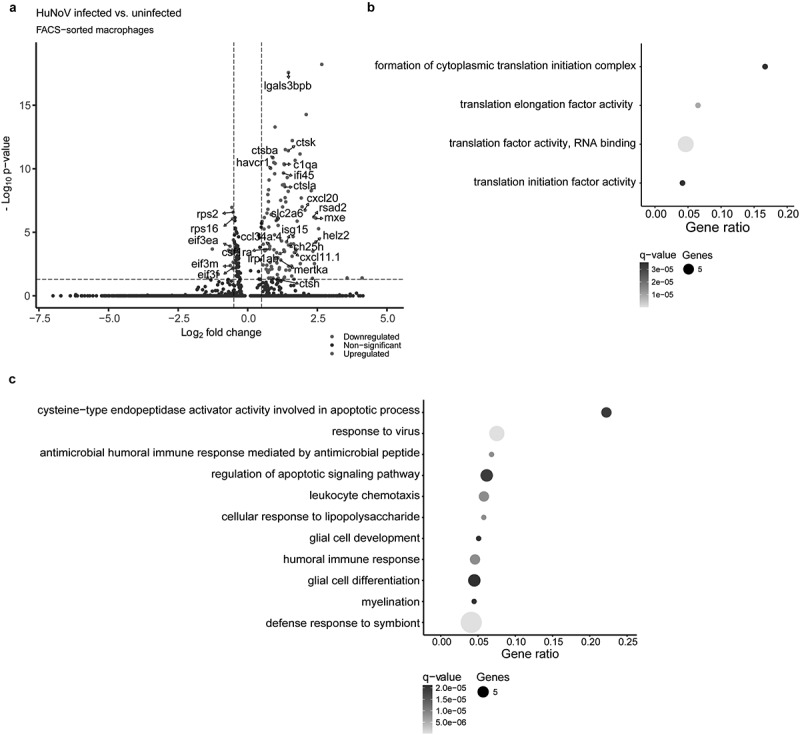 Single-cell analysis reveals inhibition of cytoplasmic translation and enhanced phagocytosis in HuNoV-infected macrophages. (a) A volcano plot shows the DEGs in HuNoV-infected vs. uninfected bystander macrophages within the HuNoV-infected zebrafish host. A vertical dotted line marks a log2(fold change) value of 0.5, while the horizontal dotted line marks a benjamini-Hochberg q-value of 0.05. Dot plot showing the pathways obtained via a ClueGO hypergeometric enrichment pathway analysis of (b) downregulated and (c) upregulated DEGs using the gene ontology - biological process database. HuNoV = human norovirus, DEGs = differentially expressed genes.