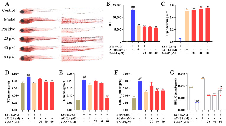 Effects of 2-AAP treatment on lipid metabolism in zebrafish after egg yolk powder feeding. (A) Typical images of zebrafish stained with Oil Red O. The whole fish was shown on the left, and the enlarged fish tails were shown on the right. (B) IOD values of Oil Red O staining in the tail, n = 10. (C) The lipid lowering rate of 2-AAP treatment, n = 10. Effects of 2-AAP treatment on TC (D), TG (E), LDL-C (F), and HDL-C (G) levels. In the column chart, brown represents the blank group, blue represents the model group, and red represents the administration group. Compared with the control group, ## p < 0.01. Compared with the model group, * p < 0.05, ** p < 0.01.