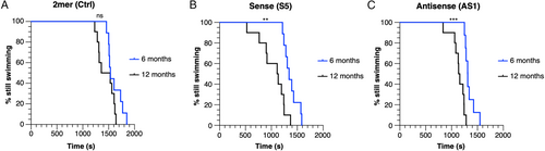 Fig. 4 Adult C9orf72-ALS/FTD zebrafish show reduced swimming endurance. Kaplan–Meier analysis of swim tunnel performance in 6-month 12-month-old zebrafish. (A) The 2mer (Ctrl) zebrafish show no significant decline in swimming endurance between 6- and 12-month time points. Both (B) sense (S5) and (C) antisense (AS1) zebrafish lines significantly decline in swimming endurance between 6 and 12 months old. N = 9 2mer (Ctrl), N = 10 sense (S5) and N = 10 antisense (AS1). Log-rank (Mantel-Cox) test; *p < 0.05, **p < 0.01, ***p < 0.001. ALS = amyotrophic lateral sclerosis; FTD = frontotemporal dementia. [Color figure can be viewed at www.annalsofneurology.org]