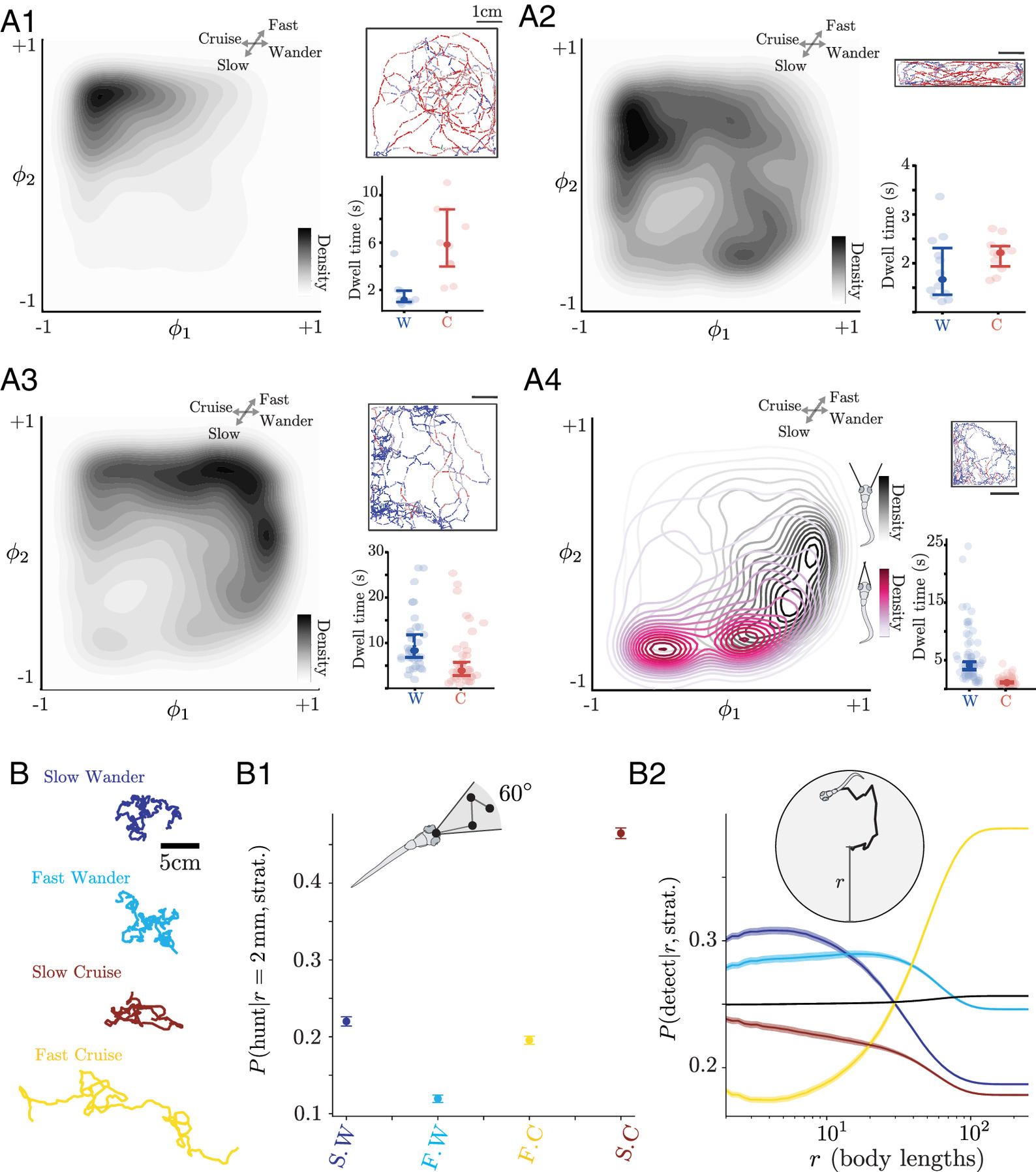 Fig. 3 Preferences for distinct motor strategies are deployed across sensory contexts. (A) Left, probability density of visiting microstates along . Right, example trajectory color coded by (Top) and median dwell time in each strategy (Bottom) (error bars represent 95% CI bootstrapped across fish, with individual fish scattered in the background). (A1) In large square arena in the light, fish mostly fast cruise ( , , 10 fish). (A2) In a smaller arena, fish in the light use wandering at the short ends when forced to reorient ( , arena, 12 fish), resulting in a reduction of time spent cruising compared to (A1). (A3) In the dark, fish show a shift toward fast wandering ( , 37 fish, data combined from the “Dark” condition and the first 30 min of the “Dark Transitions” condition; see SI Appendix, Table S1). (A4) In a prey capture assay with 50 paramecia per arena, fish mostly engage in slow cruising and wandering when the eyes are converged, and introduce faster wandering when the eyes diverge ( , arena, 65 fish). Each bout is given an eye convergence index based on the angle between the eyes (SI Appendix). Note the near absence of fast cruising when compared to (A1). (B) Probability of hunting (B1) or detecting (B2) resources in each of the motor strategies, SI Appendix, Fig. S3D1. Using data from all fish, we infer transition matrices using only the microstates belonging to each motor strategy and simulate trajectories (SI Appendix, Fig. S5). (B1) We assess the fish’s ability to hunt prey that is uniformly distributed within cone of aperture ahead of its head (eyes converged) (40) and radius. We simulate fish trajectories for the average duration of hunting sequences ( ), SI Appendix, Fig. S5A, and count successful hunts when the head trajectory is within from the prey ( 5% of the body length); see SI Appendix. In this case, slow cruising is the most successful strategy. (B2) We assess the fish’s ability to detect resources uniformly scattered within a distance from the initial position (41) We now simulate 1,000 bout-long trajectories, and assume that the fish can detect resources within a distance around its head position (SI Appendix). In this case, the wandering states are most effective up to mesoscale search ( ) while fast cruising is effective at large scale dispersal. The black line represents the behavior of an average fish. Errorbars and shaded areas correspond to bootstrapped 95% CI obtained from 10,000 simulations from random initial conditions.