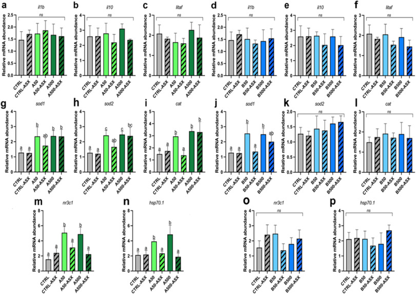 Fig. 5 Real-time qPCR results. Relative mRNA abundance of genes involved in immune response (il1b, il10, litaf) analysed in the intestine and involved oxidative stress response (sod1, sod2, cat) and stress response (nr3c1 and hsp70.1) analysed in the liver of adult zebrafish fed the experimental diets. (a-c; g-i; m,n) groups fed A-diets (A50, A50-ASX, A500, A500-ASX) compared to those fed the CTRL ones (CTRL and CTRL-ASX); (d-f; j-l; o,p) groups fed B-diets (B50, B50-ASX, B500, B500-ASX) compared to those fed the CTRL ones (CTRL and CTRL-ASX). Data are reported as mean ± SD (n = 5). a-c Different letters denote statistically significant differences among the experimental group. ns, no significant differences among the experimental groups (p > 0.05).
