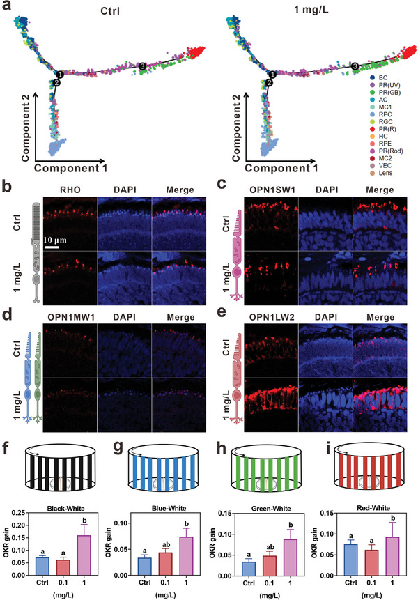 The number and function alteration of PR cells in zebrafish after exposure to InP/ZnS QDs. a) Pseudotime trajectory analysis of retinal cell development with Monocle. Each dot is a single cell and its color is agreement with its cluster assignment. b–e) The representative images of PR(Rod), PR(UV), PR(GB), and PR(R) of zebrafish at 72 hpf stained by RHO b), OPN1SW1 c), OPN1MW1 d), and OPN1LW2 e), respectively. f–i) The scheme and gain of optokinetic response (OKR) of 168‐hpf zebrafish in Black‐White f), Blue‐White g), Green‐White h), and Red‐White stripes i), n ≥ 5. The data are presented as mean ± SE. Significant change among different groups (