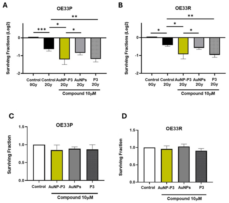 Pyrazinib-functionalised gold nanoparticles (AuNP-P3) enhanced radiosensitivity in an the OAC cell line model of radioresistance. The effect of pyrazinib-coupled gold nanoparticles (AuNP-P3), pyrazinib (P3), and gold nanoparticles (AuNPs) at 10 µM treatment on the radiosensitivity of OE33P (radiation sensitive) and OE33R (radioresistant) cells was assessed by clonogenic assays and compared to the control (0.1% DMSO + 0.1% water). Surviving fraction of OE33P (