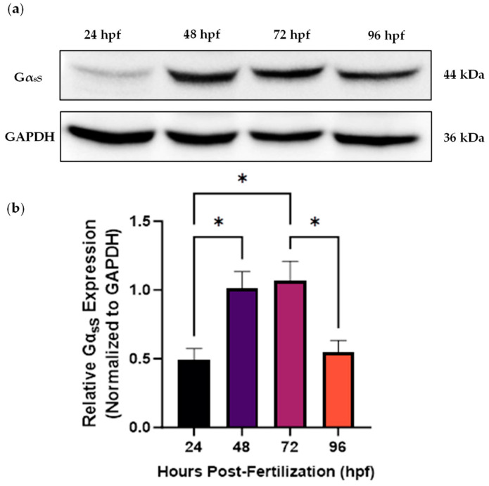 Western blot analysis of the temporal expression pattern of the short Gαs isoform (GαsS) in whole wild-type zebrafish from 24 to 96 h post-fertilization (hpf). (