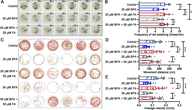 Fig. 2 The addition of FA can improve the abnormal movement behaviors of zebrafish embryos or larvae induced by exposure to BPA. (A) A stereo fluorescence microscope was used to record a video of the tail oscillatory movement of zebrafish embryos at 24 hpf. The sequence of pictures shows intervals of 30 seconds. (B) The frequency of tail oscillation was calculated for the 24 hpf embryos. (C) The movement trajectory, (D) total movement distance and (E) average speed of 6dpf larvae within a 10-minute period were also analyzed. Significance levels are denoted as follows: *P<0.05; **P<0.01; ***P<0.001; ****P<0.0001. Error bars represent the standard error of the mean.
