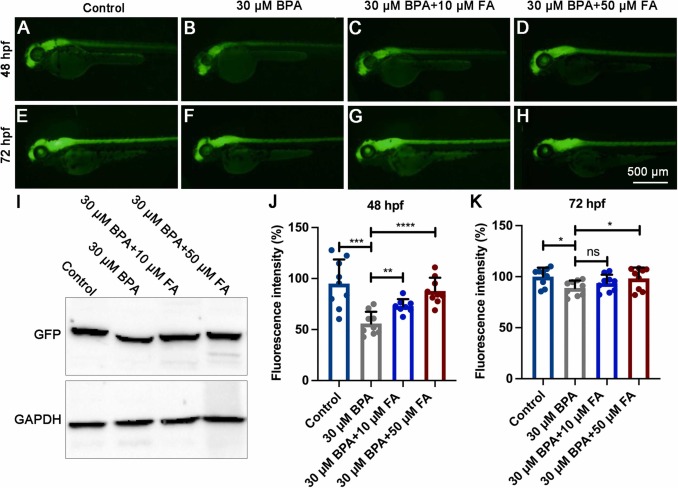 Fig. 3 The neuron-specific GFP expression in transgenic tg(elavl3:GFP) zebrafish larvae exposed to BPA was reversed by FA. (A-H) The fluorescence intensity of neuron-specific GFP in the brain and spinal cord was measured at 48 hpf and 72 hpf. (I) Western blot analysis was performed to detect the expression of the GFP protein in transgenic tg(elavl3:GFP) zebrafish larvae at 48 hpf (n=50). (J-K) It was observed that the FA supplementation group significantly reversed the fluorescence intensity (n=9). Significance levels are denoted as follows: *P<0.05; **P<0.01; ***P<0.001; ****P<0.0001. The error bars in the figures indicate the standard error of the mean.
