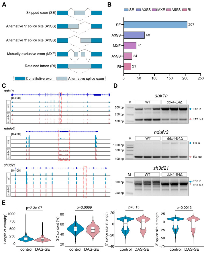 Identification of differential alternative splicing events between WT and ddx4-E4Δ zebrafish ovaries. (A) Five types of alternative splicing events analyzed in this study are shown. (B) The numbers of DASEs for each AS type between WT and ddx4-E4Δ ovaries are shown. (C) RNA-seq tracks of aak1a, ndufv3, and sh3d21 are shown. The alternative exons are indicated with boxes. (D) RT-PCR validation of the three selected DASEs. Original gel images are shown in Figure S1B. (E) The differentially spliced exons affected by ddx4-L knockout have relatively shorter length, higher GC contents, similar 5′ splicing sites, and stronger 3′ splicing sites.