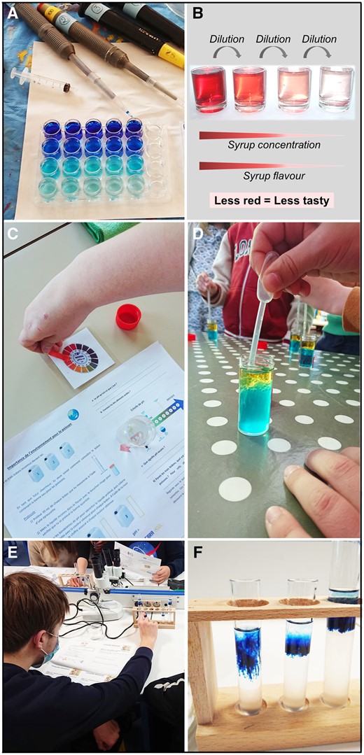 Fig. 4 It is nice to experiment, but what do the colours means? (A) The principle of dilution with coloured chemistry workshop. Methylene blue serial dilutions in multi-well plates. (B) Dilutions of strawberry syrup in water to correlate the decrease in colour observed with the decrease in taste according to the dilution made. (C) The pH of water workshop. Using pH paper to measure water pH used for fish rearing. (D) Impact of pollution on the food chain workshop. Experiment that mimics the impact of an oil spill on aquatic organisms through the modification of air/water gas exchanges due to the hydrophobic nature of oil. (E, F) DNA extraction performed during the genetics workshop.