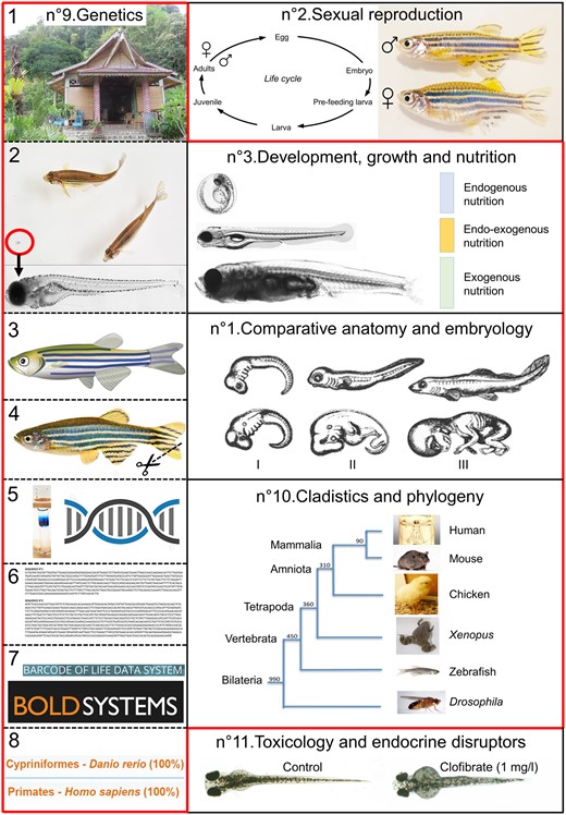 Fig. 5 Modular architecture of the ZebraCool programme. Table illustrates the design of the combined GDE workshop. Left panel: Dotted black lines define the steps of the Genetic workshop (n°9). Right panel: Full black lines partially surround two of the twelve thematic workshops using the zebrafish model; red lines surround the four thematic workshops that constitute the combined GDE workshop (n°1, 3, 9, and 10). See also Supplementary file documents: Educational presentation used by the ZebraCool educators and Students’ notebook for the GDE combined workshop. Additional workshops can be associated, such as sexual reproduction and/or toxicology and endocrine disruptors to propose a broader multi-thematic activity, if desired.