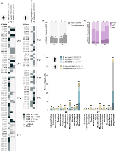 Fig. 1 Antimicrobial screening of Actinomycetota isolated from C. crispus (CC) and C. tomentosum (CT). (A) Strains with bioactivity in the antimicrobial assay. Only strains active towards at least one reference microorganism are presented. Data displayed as average measurement (mm) of the inhibition halos (IH) diameter from two independent experiments. Strains highlighted in bold presented inhibitory effect towards the growth of at least one human and fish health-relevant reference microorganism. (B) Distribution of active and non-active strains retrieved from CC and CT. (C) Distribution of active strains according to their fermentation medium. (D) Genus-level taxonomic distribution of active strains. Taxonomic groups highlighted in bold were found in both macroalgae. The source of isolation, holdfast (●) or blade (▲), is indicated in all graphs.
