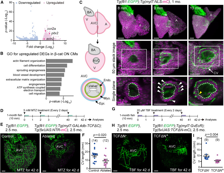 Fig. 3 β-cat ON CMs contribute to CV formation (A) A volcano plot showing differentially expressed genes (DEGs) between β-cat ON and OFF CMs (n = 3). Note that Wnt target genes (red circle) were upregulated. (B) Gene Ontology (GO) enrichment analysis of genes upregulated in β-cat ON CMs. (C) Schematic illustration of the heart (left) and representative images of the hearts of 1-month-old Tg(fli1:EGFP);Tg(myl7:NLS-mCherry) fish with body length indicated at the top (right). Hearts were made transparent with CUBIC-1A. Lateral projections (top), 50 μm stacked images of the dorsal view around the AVC (middle), and single slice images of the boxed regions (bottom). Dotted lines outline the heart lumen. Endothelial cells (ECs) are observed in the CM layer (white arrowheads). Coronary vessels (CVs) connect with endoECs at the AVC (yellow arrowhead). (D) Experimental design for specific ablation of nitroreductase-expressing (NTR-expressing) cells of the fish used in (E) by metronidazole (MTZ) treatment. 1-month-old fish were treated with 5 mM MTZ every 2 days and analyzed after 42 days of treatment. (E) Representative images of the CVs of Tg(fli1:EGFP) or Tg(fli1:EGFP);Tg(myl7:GAL4db-TCFΔC);Tg(5xUAS:NTR-mCherry) fish at 2.5 months treated with MTZ. A control heart (left) and a β-cat ON CM-ablated heart (right). (F) Quantitative analysis of the data shown in (E). The length of CVs was measured by tracing the length of fli1:EGFP+ coECs. (G) Experimental design for CM-specific induction of dominant negative TCF (TCFΔN) by tebufenozide (TBF) treatment in the fish used in (H). Fish were treated with 20 μM TBF every 2 days and analyzed after 42 days. (H) Representative images of the CVs of Tg(fli1:EGFP) or Tg(fli1:EGFP);Tg(myl7:GvEcR);Tg(5xUAS:TCFΔN-mCherry) fish at 2.5 months treated with TBF. A control heart (left) or a TCFΔN-expressed heart (right). (I) Quantitative analysis of the data shown in (H). Scale bars, 100 μm. Data are mean ± SEM. Statistical analysis was performed by two-tailed Student’s t test (F) or Mann-Whitney U test (I). CV, coronary vessel; Endo, endocardium; Epi, epicardium; Myo, myocardium. See also Figure S3, Table S1, and Video S1C.