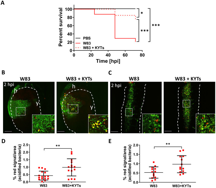 (A) Kaplan-Meier survival plot of zebrafish larvae (30 hpf) infected with wild-type