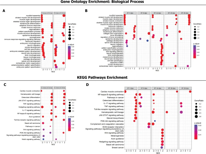 Fig. 2 Gene set enrichment analysis reveals biological processes and pathways enriched across stages of tail regeneration and in the embryonic tail. A Biological process enrichment in regenerating tail vs. embryonic tail. B Biological processes enrichment at different stages of tail regeneration. C Pathway enrichment in regenerating tail vs. embryonic tail. D Pathway enrichment at different stages of tail regeneration. ET embryonic tail, RT regenerating tail. The more extensive results are shown in Additional file 7: Fig. S6, Additional file 8: Fig. S7, Additional file 9: Suppl_ 2 and Additional file 10: Suppl_ 3