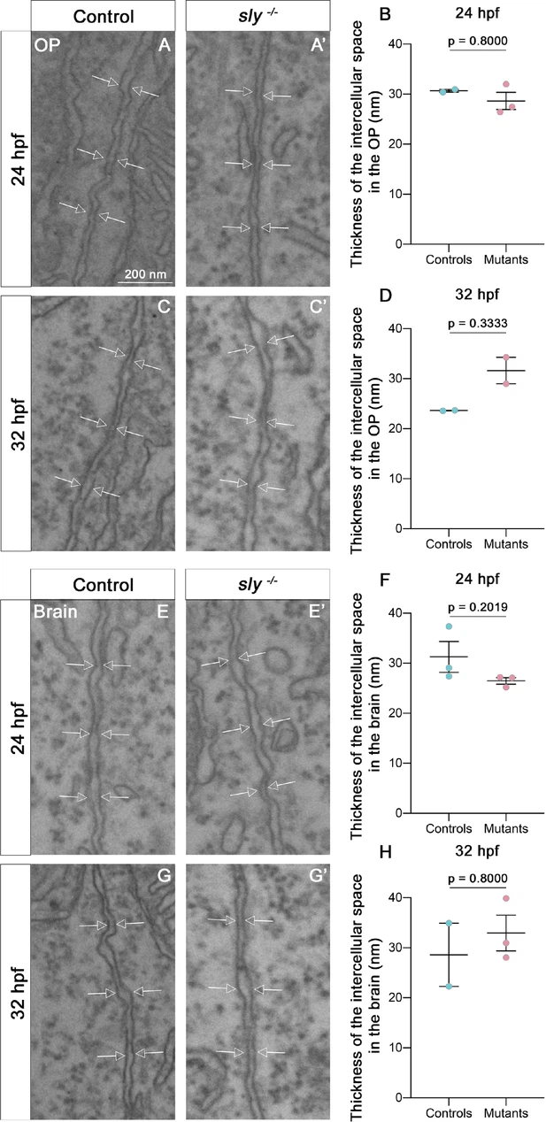 Fig. 2 - Supplemental 1 Electron microscopy analysis of intercellular spaces in the OP and brain tissues. A, A’ and C, C’ Examples of images of the intercellular space located between OP cells in control siblings (A, C) and in sly mutants (A’, C’), at 24 and 32 hpf. Arrows = plasma membranes. (B, D) Thickness of the intercellular space in the OP tissue in sly mutants and control siblings at 24 (n=2 controls; n=3 mutants) and 32 hpf (n=2 controls; n=2 mutants). (E, E’ and G, G’) Examples of images of the intercellular space located between brain cells in control siblings (A, C) and in sly mutants (A’, C’), at 24 and 32 hpf. Arrows = plasma membranes. (F, H) Thickness of the intercellular space in the brain tissue in sly mutants and control siblings at 24 (n=3 controls; n=3 mutants) and 32 hpf (n=2 controls; n=3 mutants). Mann Whitney tests except for F: unpaired, two-tailed t-test.