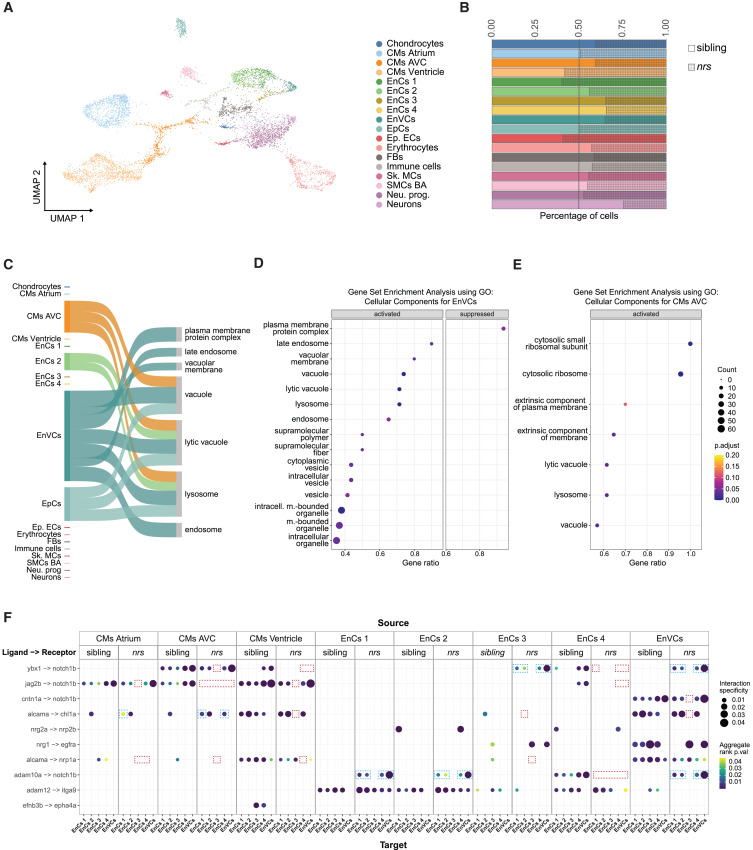 Fig. 6 Expression of lysosome related genes and notch1b-signalling is affected in nrs-mutants Results obtained from a snRNA transcriptome analysis of sibling and nrs mutant hearts at 3 dpf. (A) UMAP showing the various identified cell types from the snRNA-seq performed for mutant and sibling hearts at 3 dpf. (B) The proportion of different cell types observed in sibling versus mutant suggest that lysosomal impairment above all affects the representation of atrioventricular cardiomyocytes (CMs AVC), three endocardial populations (EnCs 3, EnCs 4) among them endocardial valve cells (EnVCs) and neurons in the larval heart. (C) Sankey diagram illustrates the cell-specificity of overrepresented lysosomal and membrane related gene pathways found in nrs mutants compared to siblings highlighting the relevance of lysosomal degradation in EnVCs. The width of the arrows is proportional to the number of differentially expressed genes in each cell cluster contributing to the pathway. (D and E) Gene set Enrichment Analysis using the differentially expressed genes between siblings versus mutants in EnVCs (D) and atrioventricular CMs (E), where ‘activated’ and ‘suppressed’ represent the pathways that are activated or suppressed in the mutant condition. The results obtained suggest an upregulated transcriptional response in mutant EnVCs and atrioventricular CMs to compensate impaired lysosomal function. (F) Ligand-receptor analysis from LIANA depicting the ligands from the source cells (top) to target cells (bottom) with ligand and receiving receptor shown on the y axis in the sibling and the mutant conditions. The ligand-receptor interactions affecting notch1b- and alcama-signaling are highlighted for the nrs mutant (red square = missing interaction, blue square = differing interaction).