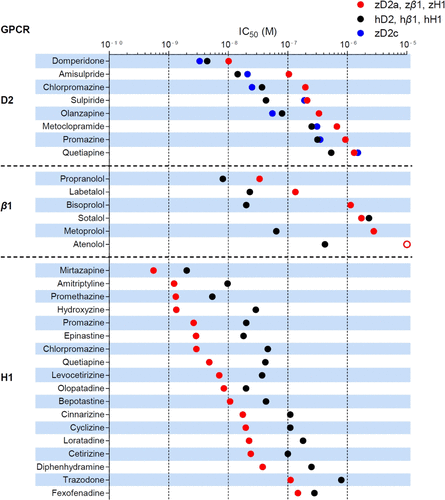 Fig. 1 IC50 values of GPCR-acting pharmaceuticals against human (hD2, hβ1, and hH1) and zebrafish (zD2a, zD2c, zβ1, and zH1) receptors. Plots indicate the mean IC50 values (M) of GPCR-acting pharmaceuticals measured in the present study. Red (zD2a, zβ1, and zH1) and blue (zD2c) plots are IC50 values for zebrafish GPCRs, and black plots indicate IC50 values for zebrafish GPCRs (hD2, hβ1, and hH1). Red open circle indicates that the IC50 was >10–5 M; atenolol against zβ1 receptor did not reach 50% AP-TGFα release in the tested concentration range (10–10 to 10–5 M). The IC50 values of GPCR-acting pharmaceuticals against human GPCRs (hD2, hβ1, and hH1) were cited from our previous study. (28)