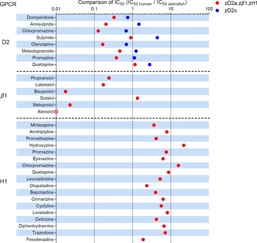 Fig. 2 Comparison of IC50 values of pharmaceuticals between human and zebrafish GPCRs plots indicate the ratio of IC50 values of pharmaceuticals against human and zebrafish GPCRs. Ratio > 1 indicates that zebrafish GPCRs were more strongly inhibited by pharmaceuticals; <1 indicates that human GPCRs were more strongly inhibited by pharmaceuticals. Red open circle indicates that the ratio was below 0.01 because the IC50 of atenolol against zβ1 receptor was not detected in the tested concentration range.