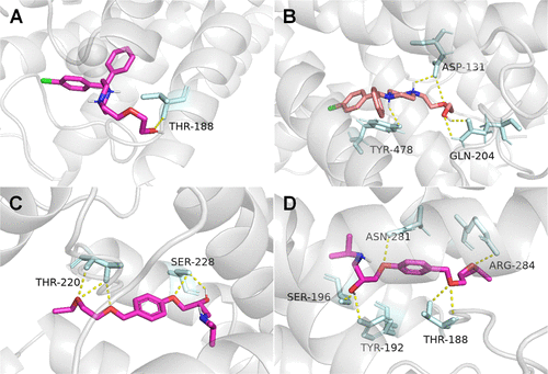 Fig. 3 Molecular docking of ligand–GPCR interactions. Most favorable docking positions for hydroxyzine with the (A) hH1 and (B) zH1-active regions, and for bisoprolol with the (C) hβ1 and (D) zβ1-active regions. The homology models of zH1, hβ1, and zβ1 were generated by the SWISS-MODEL (Figure S5). The ligand for hH1 and zH1 was hydroxyzine, and the ligand for hβ1 and zβ1 was bisoprolol. Yellow dashed lines indicate hydrogen bonds between the ligand and amino acid residues. The amino acid residues which formed hydrogen bonds are shown in the figures.