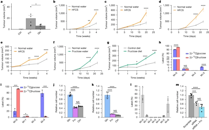 Fig. 1 Dietary fructose supports tumour growth in vivo but fructose is not efficiently metabolized by cancer cells in vitro.a, Tumour regrowth 2 weeks after tumour amputation from BRAF/p53 zebrafish in control water (Ctrl, n = 5), water containing fructose (Frc, n = 6) or water containing glucose (Glc, n = 6). No regrowth was detected in the control water condition. Data are representative of two experiments. b–e, Tumour outgrowth after BrafV600EPten−/− melanoma (n = 7) (b), E0771 cells (normal water, n = 10 and HFCS, n = 9) (c), E6/E7-expressing TC-1 cells (normal water, n = 16 and HFCS, n = 13) (d) and CaSki cells (normal water, n = 5 and HFCS, n = 5) (e) were implanted subcutaneously (b,d,e) or into the mammary fat pad (c) of mice supplemented with normal water or 20% HFCS water. f,g, Tumour outgrowth of subcutaneous E6/E7-expressing TC-1 tumours in mice supplemented with normal water (n = 16) or 10% fructose water (n = 13) (f) and of subcutaneous CaSki tumours in mice on a control diet (n = 5) or a high-fructose diet (n = 7) (g). h,i, The isotopologue distribution for lactate from BRAF/p53 zebrafish melanoma cells cultured ex vivo (n = 3) (h) or CaSki cells (n = 3) (i) after 4 h of labelling with 5 mM [U-13C]glucose or 5 mM [U-13C] fructose. j,k, Zcrest C BRAF/p53 zebrafish melanoma cells (n = 5 per condition) (j) and CaSki cells (n = 5 per condition) (k) were cultured in medium with 10 mM glucose (Glc), 10 mM fructose (Frc) or no sugar (Ctrl). l, The isotopologue distribution for endogenous fructose from CaSki cells cultured with [U-13C]glucose (n = 3). m, The relative cell number after administering sorbitol dehydrogenase small interfering RNA (siRNA, n = 4), scrambled control (scramble, n = 5), or sorbitol dehydrogenase siRNA and 10 mM fructose (siRNA + Frc, n = 5) to CaSki cells. Except where indicated, experiments in this figure were performed once. P values were determined using unpaired t-tests comparing the fructose and glucose conditions (a), two-way analysis of variance (ANOVA) with Šídák’s multiple-comparisons test (b–g), multiple unpaired t-tests (h and i) or ordinary one-way ANOVA with Tukey’s multiple-comparisons test (j, k and m); *P < 0.05, **P < 0.01, ***P < 0.001, ****P < 0.0001; NS, not significant. Data are mean ± s.e.m (b–g) and mean ± s.d. (a and h–m).