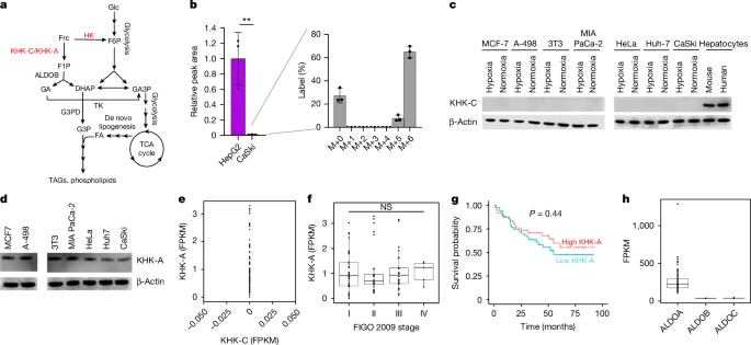 Fig. 2 Transformed cells express KHK-A but not KHK-C.a, Schematic of fructose metabolism through hexokinase, KHK-C and KHK-A. F6P, fructose 6-phosphate; HK, hexokinase; F1P, fructose 1-phosphate; ALDOB, aldolase B; GA, glyceraldehyde; DHAP, dihydroxyacetone phosphate; GA3P, glyceraldehyde 3-phosphate; TK, triokinase; G3P, glycerol 3-phosphate; G3PD, glycerol 3-phosphate dehydrogenase; FA, fatty acid; TCA, tricarboxylic acid; TAG, triacylglycerol. b, Relative peak area of M+6 fructose 1-phosphate in CaSki cells (n = 3) compared with HepG2 hepatocytes (n = 3) administered 5 mM [U- 3C]fructose for 4 h. The pool of labelled fructose 1-phosphate is orders of magnitude larger in HepG2 hepatocytes, but the inset shows that fructose 1-phosphate is 13C-labelled in CaSki cells after 4 h of being cultured with 5 mM [U-13C]fructose (n = 3). c, Western blot analysis of KHK-C from the indicated cell lines or primary cells. d, Western blot analysis of KHK-A from the indicated cell lines. For e–h, data are from 99 patients treated at Washington University School of Medicine. e, The relative expression levels of KHK-A and KHK-C from patient cervical tumours. f, Patient cervical tumour stages and KHK-A isoform expression. g, Kaplan–Meier plot of the overall survival rate of patients expressing high levels of KHK-A or low levels of KHK-A. h, The relative expression levels of ALDOA, ALDOB and ALDOC from patient cervical tumours. Data in c and d are representative of two experiments. All other experiments were performed once. P values were determined using two-sided t-tests (b) and ordinary one-way ANOVA with Tukey’s multiple-comparisons test (f). Survival curves were generated using a log-rank test (g). For b, data are mean ± s.d. For the box plots in f and h, the box limits extend from the 25th to 75th percentiles, the centre line shows the median and the whiskers (f) extend to the largest and smallest values up to 1.5× the interquartile range.