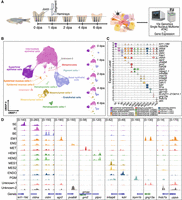 Fig. 1 Cell-type identification in regenerating zebrafish caudal fins. (A) General experimental design. Collection of zebrafish caudal fin tissues was conducted at preinjury and 1, 2, 4, and 6 dpa for subsequent library preparation and sequencing. For all samples, we first amputated the distal half of the caudal fin. For the 0 dpa samples, we collected the first two segments of the fin rays immediately after amputation. For the 1, 2, 4, and 6 dpa samples, we collected the regenerated caudal fin tissue. This experimental workflow was partially created using bioRender (https://www.biorender.com/). (B) After quality control, cells were visualized using weighted nearest neighbor (WNN) uniform manifold approximation and projection (UMAP). (Left) Cells colored by cell types; (right) UMAPs separated by time points and colored by cell types. (C) Marker gene expression. Violin plots of log-normalized RNA expression of cell-type marker genes, with colors representing different cell types. (SE) Superficial epithelial, (IE) intermediate epithelial, (BE) basal epithelial, (EM) epidermal mucous, (MET) metaphocyte, (HEM) hematopoietic, (MES) mesenchymal, (ENDO) endothelial, (PGM) pigment, (UN1) unknown-1, (UN2) unknown-2. (D) Genome browser views showing the aggregated and normalized snATAC-seq signals at promoter regions (±1 kb from transcription start site) of selected cell-type marker genes. Tracks are colored with the same color code as in B and C.