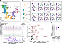 Fig. 6 MES sublineages and lineage-specific regulatory networks. (A) A UMAP plot shows MES subclusters. Cells are colored by subclusters. (B) A set of UMAP plots divided from A by time points. (C) A set of UMAP plots with embedded RNA expression of marker genes. (D) A genome browser view generated with Signac CoveragePlot displays pseudobulk snATAC-seq signals for each subcluster around the cdh11 gene. Annotations at the bottom indicate the transcript region, ATAC-seq peaks, and peak-to-gene links. Violin plot on the right side shows the normalized RNA expression levels of cdh11 across each cluster. Tracks and violin plots are colored by subclusters. (E) A scatter plot shows the top TFs in the MES_3 and MES_5 subclusters, ranked by their eigenvector centrality scores. (F) A dot plot showing RNA expression of mef2cb and lmx1ba across subclusters.