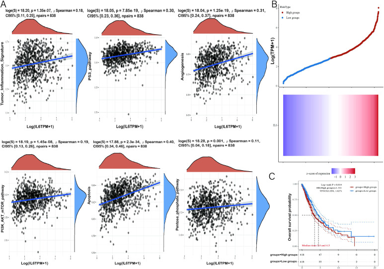 Correlation analysis of IL-6 gene with tumor-related pathways and prognosis. (A) The X-axis represents the distribution of IL-6 gene expression and the Y-axis represents the distribution of tumor signaling pathway scores. The density curves on the right side represent the distribution trend of pathway scores, and the density curves on the top side represent the distribution trend of IL-6 expression. The top values represent the results of Spearman’s correlation analysis, including p-value, correlation coefficient, and correlation calculation method. (B) The Relationship between gene expression and survival time and survival status of tumor patients in TCGA data. the upper graph represents the scatter plot of IL-6 expression from low to high, with different colors representing different expression groups; the lower graph represents the heat map of gene expression. (C) KM survival curves of the gene in TCGA data, where different groups were examined using log-rank. HR (High exp) refers to the risk coefficient of the samples in the high-expression group relative to the samples in the low-expression group. If HR > 1, the gene is a risk factor (the higher the expression, the worse the prognosis). If HR < 1, the gene is a protective factor (higher expression, better prognosis). 95% CI indicates the confidence interval of HR; median time indicates the time corresponding to the survival rate of the high expression group and the low expression group at 50% of the time. e., Median survival time in years.